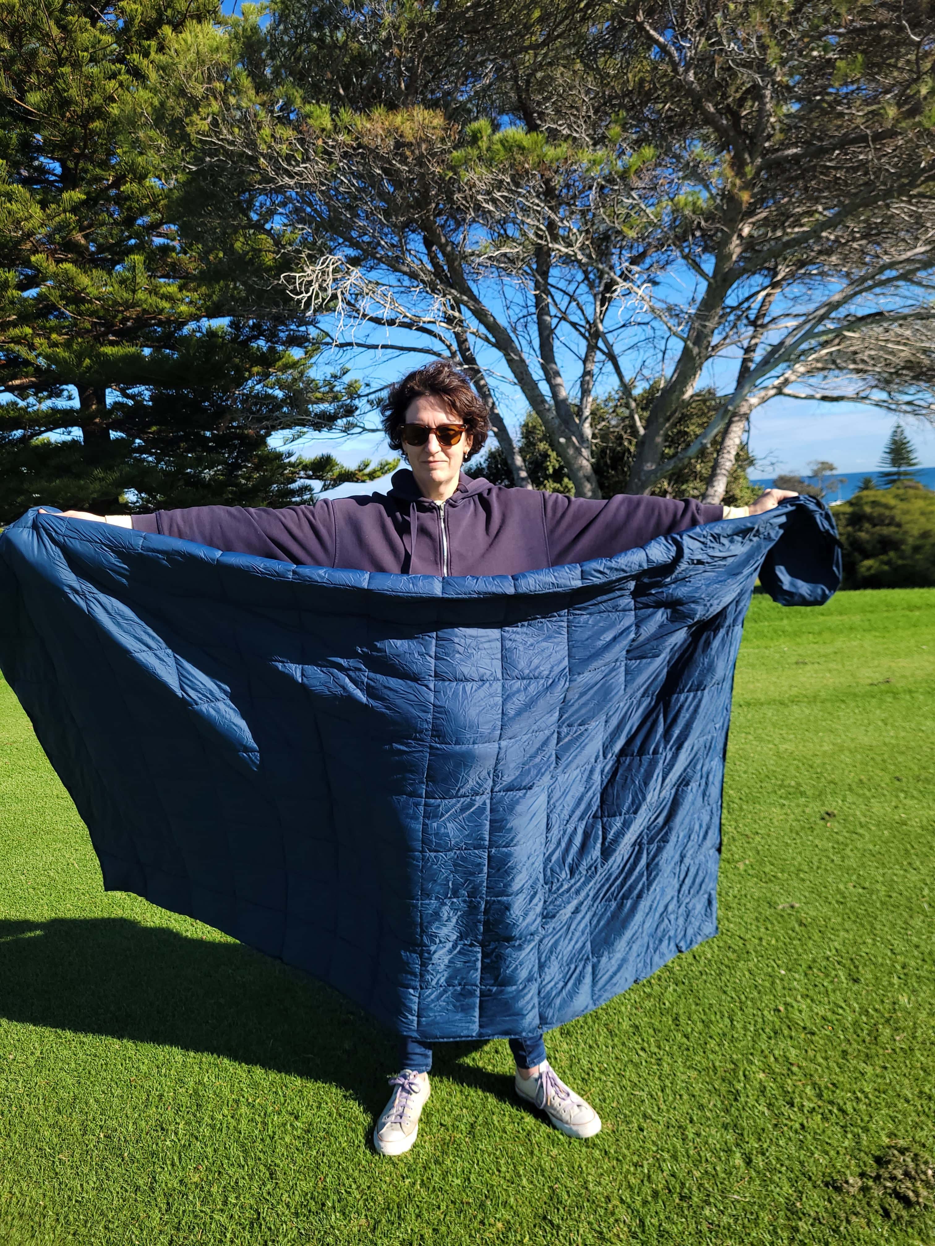 I’m currently travelling Oz in a van. Space & weight are ever present considerations. This blanket is light as a feather and folds into itself then zips up AND its ridiculously warm!!! Love it!